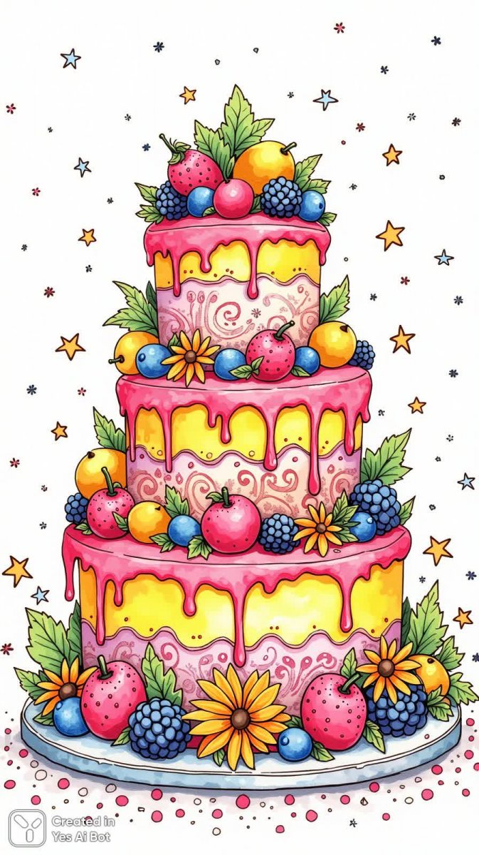 #4. zentangle drawing of a three-tiered cake with alternating layers of pink and yellow frosting, decorated with intricate patterns and fresh assorted fruits on top, surrounded by a playful border of flowers, BG is white with tiny stars, whimsical and artistic style. #role_coloring_book