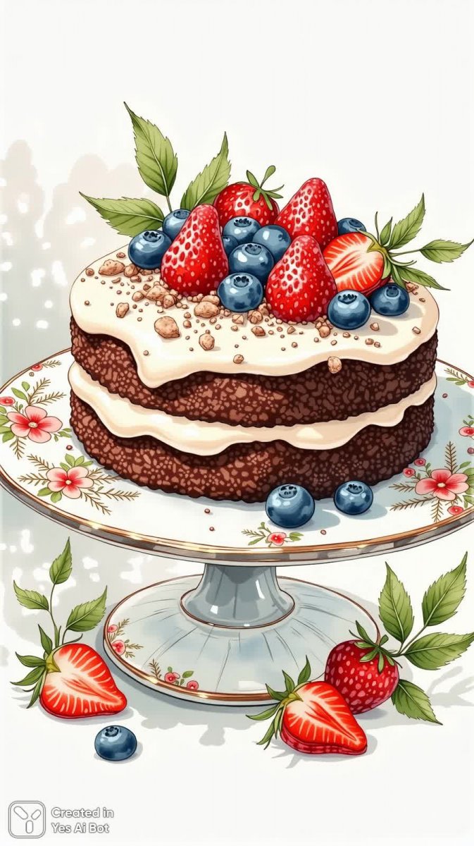 #2. doodling of a round cake with a rich chocolate base and a creamy white topping, adorned with fresh berries including strawberries and blueberries, surrounded by green leaves, plate featuring delicate floral designs, BG is soft grey, whimsical and charming style. #role_coloring_book