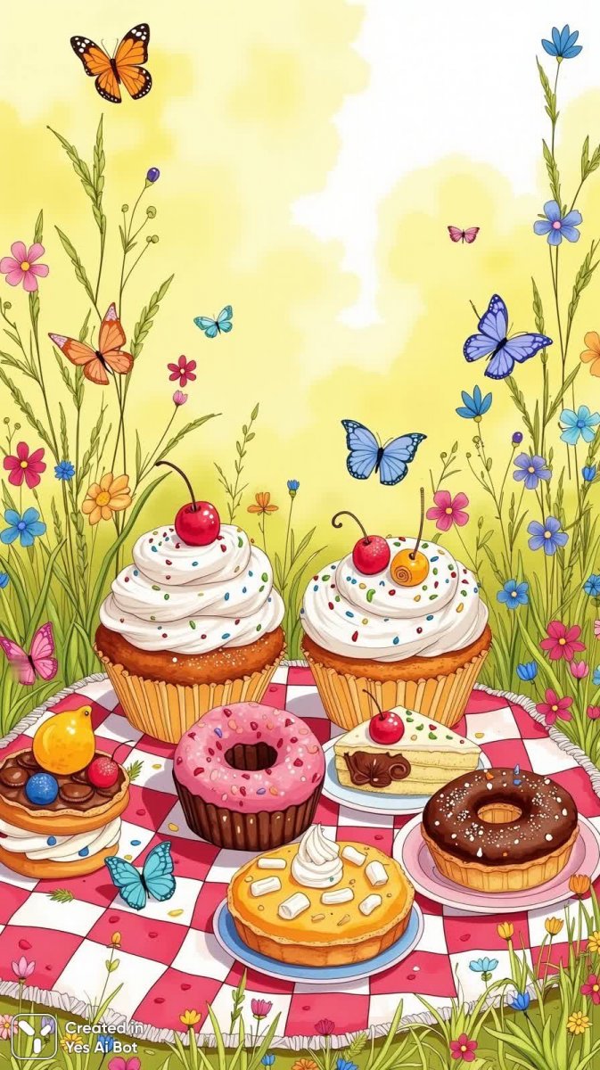 #4. doodling of a whimsical picnic scene, featuring a checkered blanket with assorted desserts including cupcakes, tarts, and donuts sprinkled with colorful toppings, surrounded by small flowers and butterflies, BG is a sunny yellow #role_coloring_book