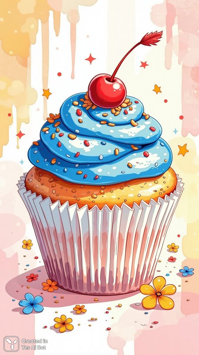 №4. мультяшный рисунок кекса с ярко-синей глазурью, украшенный посыпкой и единственной вишенкой наверху, окруженный крошечными звездами и разбросанными лепестками цветов, BG имеет мягкие полосы разных цветов, привлекательный и веселый стиль #role_coloring_book