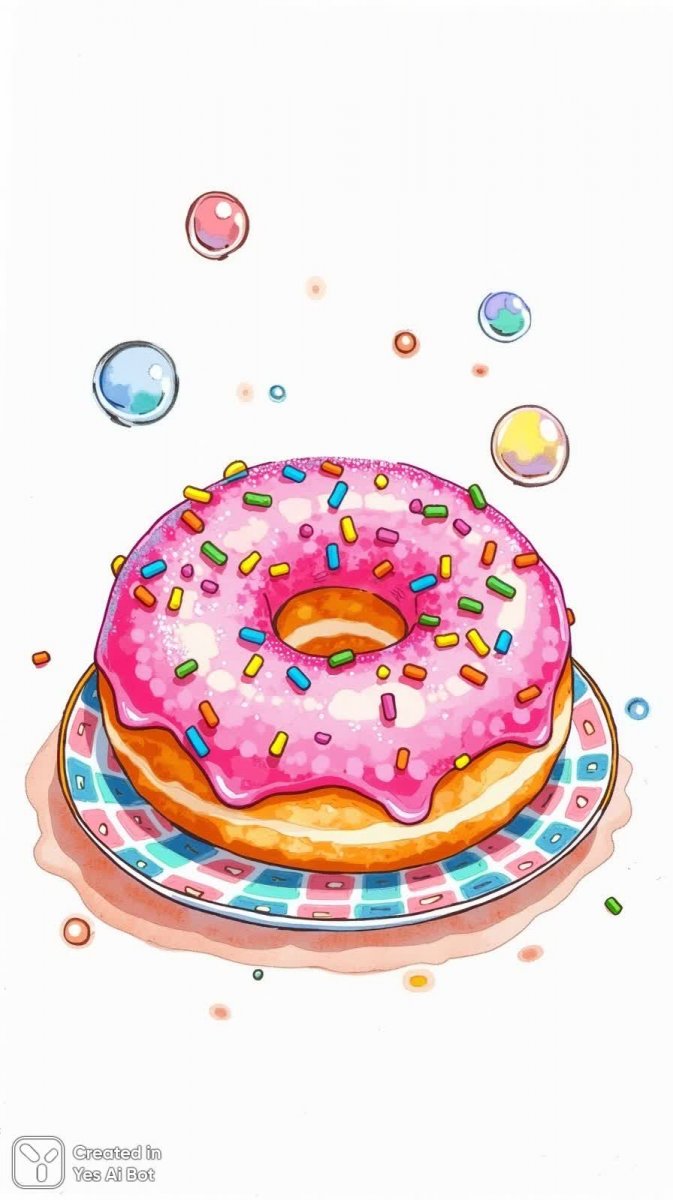 №5. наивное искусство радостного пончика, глазурованного блестящим розовым покрытием и покрытого радужной посыпкой, с игривыми узорами, помещенного на узорчатую тарелку, BG белый с плавающими маленькими разноцветными пузырьками, причудливый и восхитительный стиль #role_coloring_book