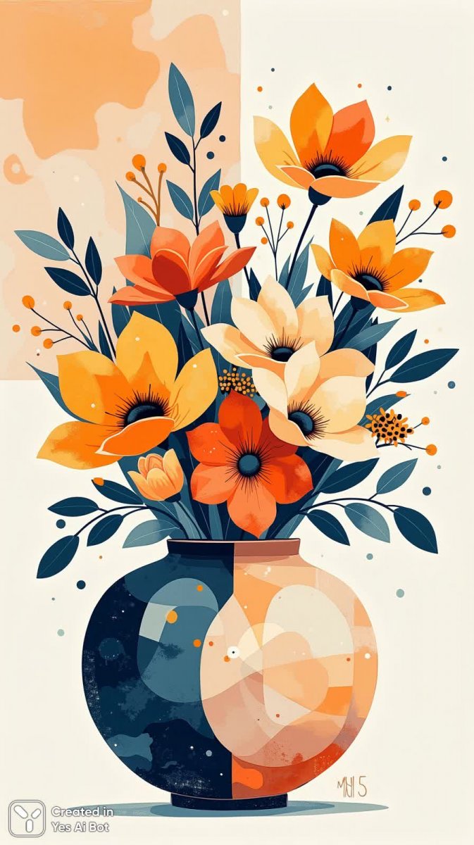 #5. vibrant abstract painting of a circular vase, filled with an explosion of flowers, arranged using geometric shapes, background composed of pastel tones and flowing lines, minimalism meets energy in design, vector art, png #role_stylistylization