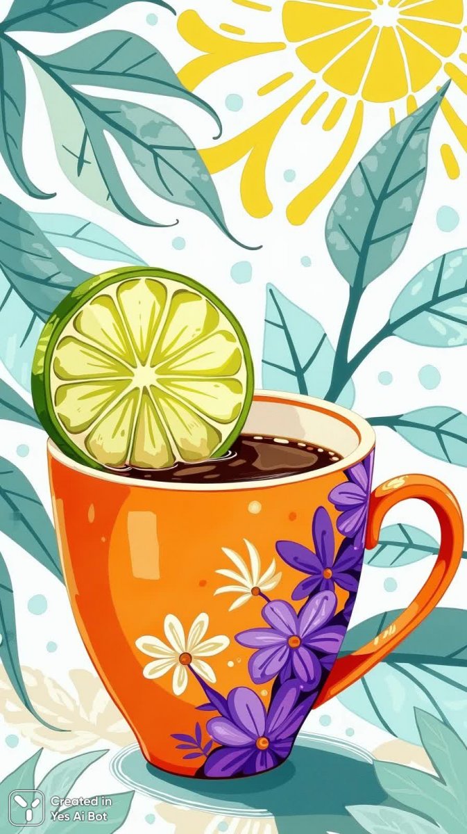 #3. vibrant illustration of orange and purple coffee cup with slice of lime, background filled with geometric patterns of light blue and yellow, creating a lively atmosphere #role_stylistylization