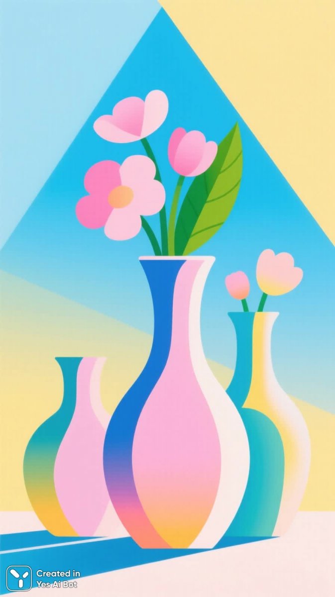 #1. abstract painting of three vases with flowers in vibrant pastel colors, arranged in triangular formation, largest vase in center is purple, flowers include soft pink and green leaves, BG is light gradient of blue and yellow, stylization features geometric shapes with soft curves, minimalism, vector art, png #role_stylistylization