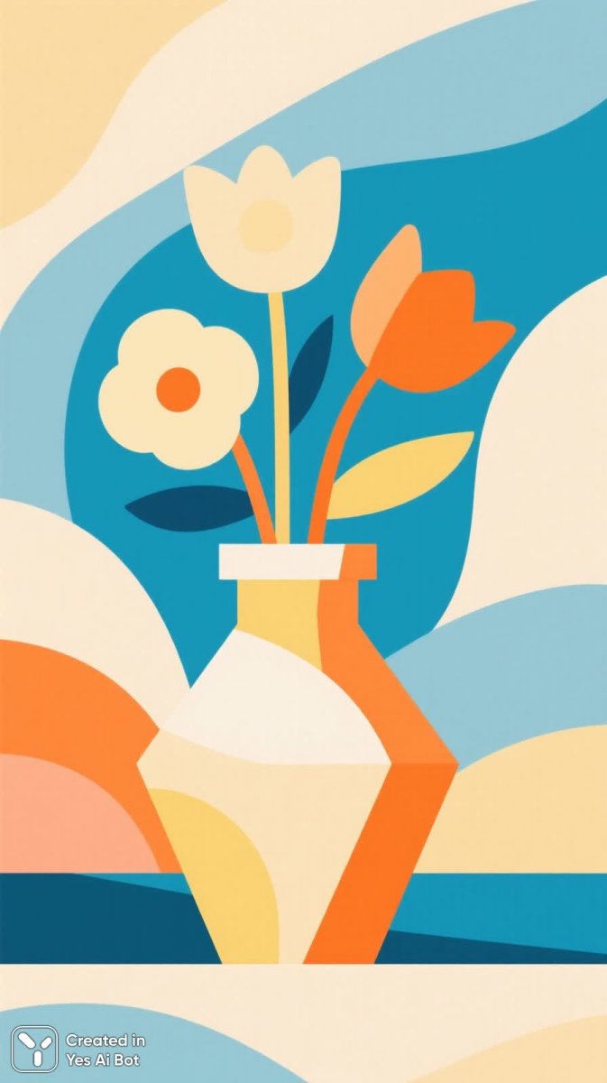 #3. abstract illustration of a minimalist vase with flowers composed of geometric shapes, colors include pastel yellow, orange, and blue, BG is filled with soft curves and shapes, creating a sense of movement, stylization in vector art, png #role_stylistylization