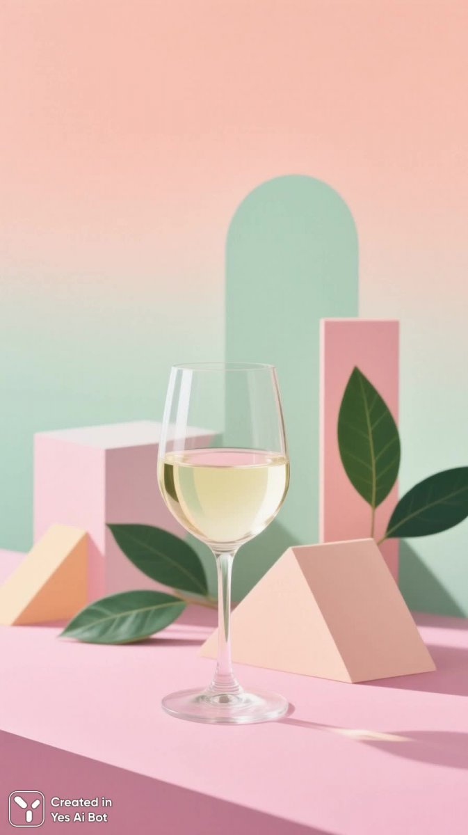 #2. glass of white wine sitting on pink surface, surrounded by geometric shapes in pastel colors, includes leaves in the arrangement creating depth, BG is a gradient of soft peach and light green, modern minimalistic style, abstract painting #role_stylistylization