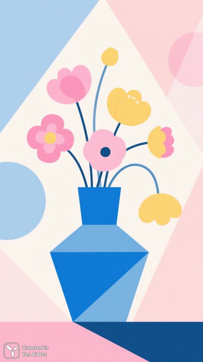 #1. abstract painting of blue vase with geometric shapes, filled with pink and yellow flowers, arranged with soft curves, BG in pastel colors with triangles and circles, stylistic minimalism, vector art #role_stylistylization