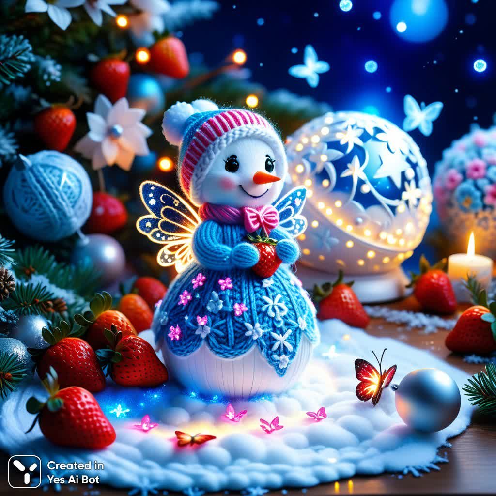 микромир, на столе, рисунок барельефы из облаков звёздочек, букет цветов ёловые ветки ёлочные шарики, клубники, бабочки, бантик, антропоморфный Снеговик в платье, дисней, выпуклые детали, вязанное искусство, белый, голубой, розовый, неоновое освещение, синий, подсветка изнутри, блеск, искры, фантастически, волшебно, сказка, фентези, красиво, высокое разрешение, 5D, высокая детализация