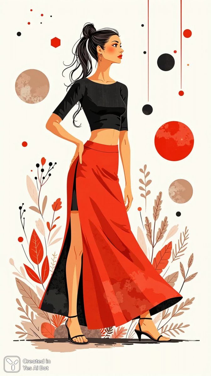 Яркая и динамичная иллюстрация в наивном стиле сочетает в себе элементы народной живописи и фэнтезийного рисунка. Изображение демонстрирует уверенную женщину в стильном образе: длинная алая юбка-макси с высокой прорезью идеально дополняется черным топом с открытыми плечами. Гладкий пучок волос подчеркивает элегантность фигуры. Фон – чистый белый, что позволяет акцентировать внимание на деталях и ярких цветах композиции. Вокруг модели расположены абстрактные геометрические формы, создающие ощущение движения и энергии. Рисунок выполнен в технике, напоминающей вырезку из бумаги и гуашевую живопись, с легкими намеками на зентангл и дудлинг. Вся работа пронизана непринужденностью и легкостью, присущими мультяшному стилю, но при этом сохраняет утонченность и индивидуальность. Это визуальное исследование моды и самовыражения, передающее ощущение свободы и уверенности в себе. Стильный силуэт женщины выделяется на фоне минималистичного фона, а геометрические фигуры добавляют графичности и современного акцента. Иллюстрация идеально подойдет для создания яркого визуального образа, подчеркивающего индивидуальность и креативность, отражая последние тенденции моды в необычном и запоминающемся исполнении. Композиция излучает позитив и оптимизм, притягивая взгляд своей простотой и выразительностью