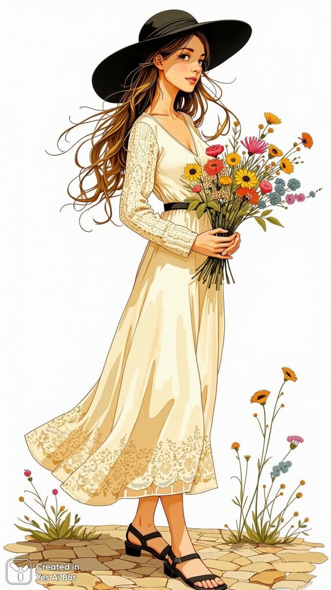 Нежная акварельная иллюстрация в наивном стиле сочетает элементы декоративного искусства и графики. Молодая женщина в изящном кремовом платье с кружевной отделкой и широкой черной шляпе запечатлена на фоне простого белого фона, создавая ощущение легкости и воздушности. Ее длинные волнистые волосы струятся по плечам, а в руках она держит букет полевых цветов, символизирующий природную красоту и невинность. Выражение лица мягкое и задумчивое, взгляд направлен в сторону, добавляя образу загадочности и романтики. Рисунок выполнен в технике, напоминающей вырезку из бумаги, с элементами зентангла и народной живописи, что придает ему уникальный шарм и неповторимый стиль. Картина излучает теплоту и утонченность, передавая атмосферу спокойствия и гармонии. Простота композиции и акцент на деталях подчеркивают элегантность модели и создают ощущение моментальной зарисовки. Это стилизация под модный журнал с акцентом на индивидуальность и творчество. Идеально подходит для любителей наивного искусства и тех, кто ценит красоту в простоте и естественности. Яркий пример современного фолк-арта в сочетании с классической элегантностью женского образа