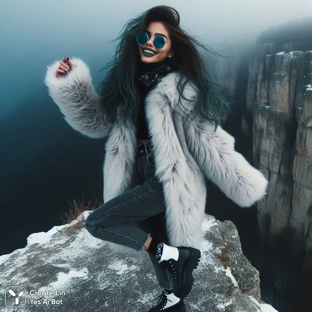 Загадочная танцовщица в зимнем тумане. Фотография, пропитанная атмосферой таинственности и экстремального приключения, запечатлевает молодую женщину в необычном образе на фоне сурового зимнего пейзажа. Её улыбка, сквозь светоотражающие очки, кажется вызовом стихии, а поза танца – символом свободы и непокорности. Детали костюма создают контрастный эффект: дерзкие черные лосины и белые кроссовки на платформе сочетаются с пушистым меховым воротником и страховочными ремнями, намекая на близость опасности. Темно-зеленые губы и косынка с росписью добавляют образу загадочности и экзотики. Длинные волосы, переливающиеся серыми, бирюзовыми и черными оттенками, развеваются на ветру, подчеркивая динамику сцены. Фон фотографии – это обрыв над скалами, уходящий в мрачную черноту зимнего неба, заснеженных вершин и густого тумана. Зернистость изображения и помехи придают снимку эффект ретро, словно он был сделан на старой плёнке, добавляя ностальгическую тоску и атмосферу нереальности происходящему. Это не просто фото – это застывший момент страсти, риска и красоты в объятиях зимней стихии. Вся композиция пронизана духом экстрима и неповторимого стиля, создавая ощущение захватывающего дух приключения на грани реальности