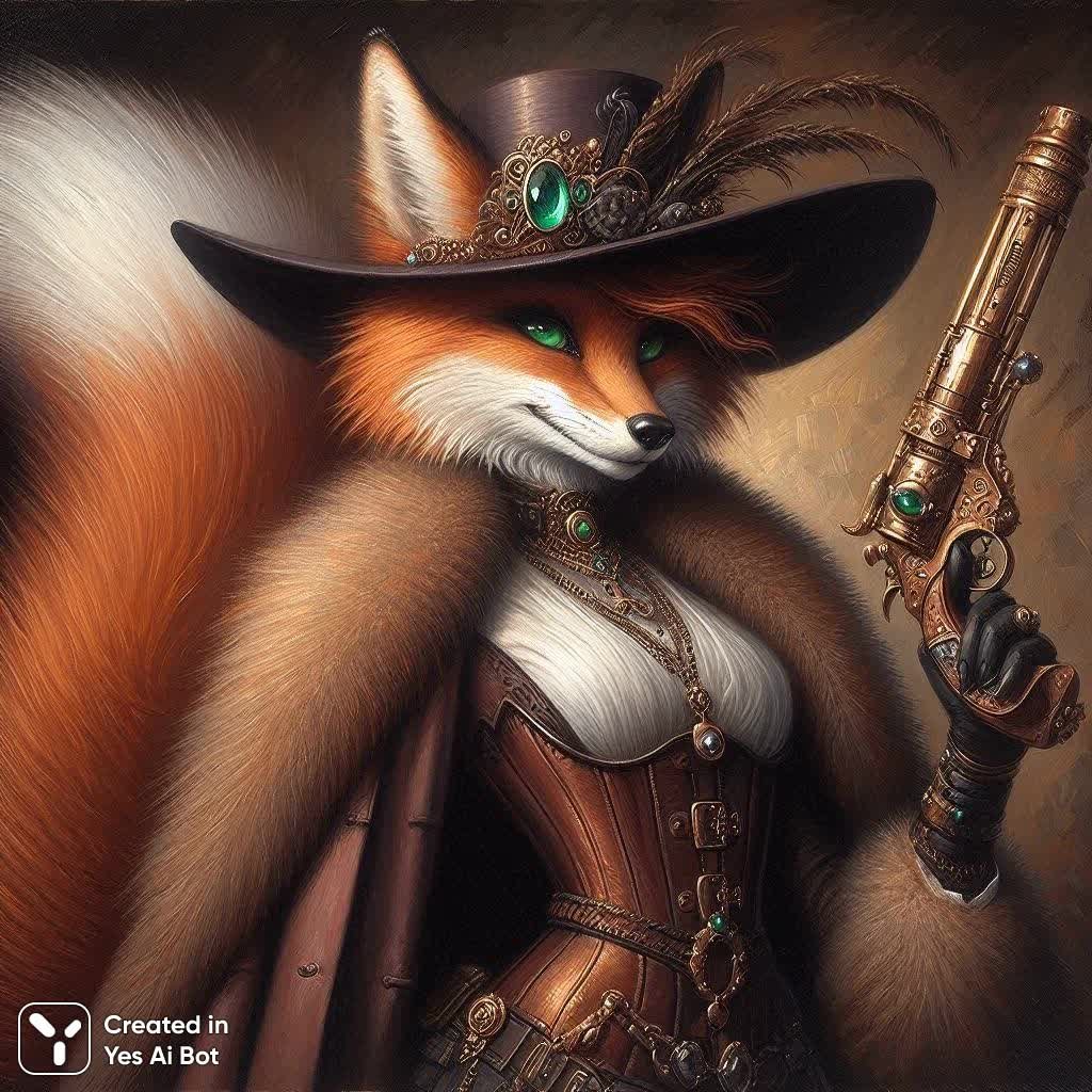 Завораживающая картина в мрачно-фэнтезийном стиле стимпанк представляет собой портрет антропоморфной лисы – элегантной и загадочной фигуры, облаченной в изысканный наряд. На голове у неё стильный головной убор, а тело подчеркнуто облегающим корсетом и чулками выше колена. Изящные перчатки с золотым кольцом дополняют образ, а короткий меховой плащ и высокие сапоги с заметным каблуком завершают ансамбль. В руках лиса держит украшенный изумрудами бластер – оружие, сочетающее в себе изящество и смертоносную мощь. Палитра картины построена на насыщенных оттенках ржавчины, глубокого лесного зеленого и металлического золота, создавая атмосферу роскоши и опасности. Мазки кисти выполнены в технике импасто, придавая текстуре живописи объемность и выразительность. Драматическое кинематографичное освещение подчеркивает детали ткани и меха, а сложные элементы стимпанка – шестеренки, латунные фурнитуры и тонкие механические акценты – добавляют образу уникальности и глубины. Это высокостилизованный портрет в полный рост, выполненный с безупречным вкусом и без каких-либо откровенных сцен. Картина представляет собой единого оригинального персонажа и обладает качеством, присущим лучшим работам с платформы ArtStation, при этом полностью соответствуя требованиям модерации. Соотношение сторон 3:4, высокая детализация (s 1000) и стиль raw обеспечивают максимальную реалистичность и художественную выразительность изображения. Версия 7 гарантирует использование самых современных технологий в процессе создания произведения искусства