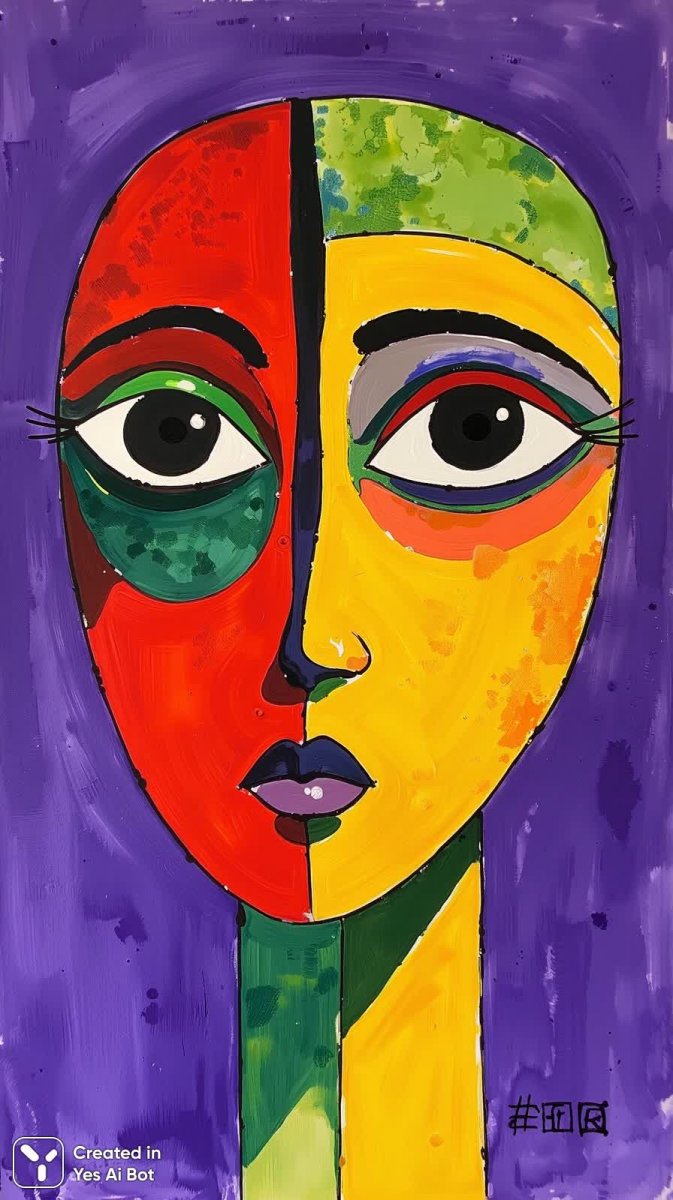 #2. vibrant abstract painting with a background of deep purple, face made from geometric shapes in red, green, and yellow, large round eyes with black pupils, using bold lines and textures to create depth, minimalism and stylization combined for a modern appeal, small pointed nose and extended mouth defined. #role_square_portrait