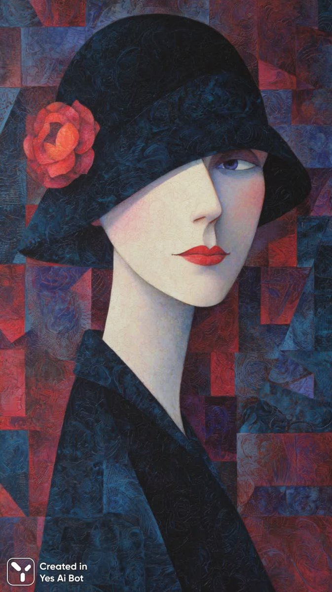 Яркий красочный рисунок чернилами изображает загадочную женщину с выразительным большим носом, подчеркнутым акцентами глубокого красного и синего цветов. Её образ дополнен элегантной чёрной шляпой и ярким алого цветом цветка, создавая эффектный контраст. Фон картины представляет собой захватывающую смесь разнообразных геометрических узоров, придающих произведению динамичность и глубину. В композиции органично сочетаются элементы современного кубизма: смелые цвета, нарочитая асимметрия и деконструкция форм. Художник использует насыщенную палитру, чтобы выделить ключевые черты лица женщины, подчеркивая её индивидуальность и неповторимость. Картина словно приглашает зрителя в мир абстрактных форм и ярких красок, где реальность переплетается с фантазией. Это произведение искусства – не просто портрет, а скорее исследование красоты через призму геометрических фигур и смелых цветовых решений, отражающее дух модернизма и творческий поиск художника. Стиль рисунка одновременно современный и вневременной, сочетающий в себе элементы экспрессии и сдержанности. Использование чернил позволяет создать плавные переходы цвета и тонкие линии, добавляя изображению изысканности и глубины. Вся картина пронизана энергией и динамикой, захватывая внимание зрителя и заставляя задуматься о красоте и гармонии в окружающем мире