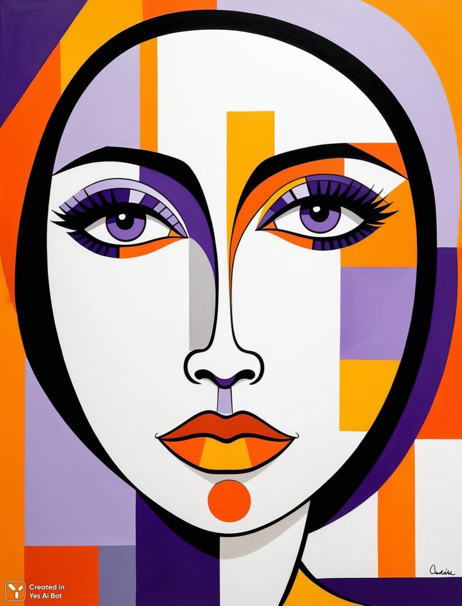 Яркий портрет женщины в стиле кубизма сочетает смелые цвета и геометрические формы, создавая динамичное и запоминающееся изображение. Лицо изображено с акцентом на выразительные глаза и пропорциональные черты носа и губ. Художник использует мягкие кривые для смягчения резкости углов, что придает работе ощущение гармонии и баланса. Фон представляет собой пеструю мозаику из оранжевых фиолетовых и желтых оттенков которые добавляют глубину и визуальный интерес к композиции. В целом стиль работы можно охарактеризовать как минималистичный и асимметричный, что подчеркивает современный подход к классической теме портрета. Картина передает ощущение силы женственности и внутреннего спокойствия через игру цвета формы и пространства. Это произведение искусства станет прекрасным украшением любого интерьера добавив в него нотку элегантности и оригинальности. Стиль рисунка демонстрирует мастерство художника в использовании простых геометрических форм для создания сложного и выразительного образа. Портрет излучает ауру загадочности и притягательности заставляя зрителя задуматься о личности изображенной женщины. Цветовая палитра подобрана таким образом чтобы вызвать положительные эмоции и создать атмосферу тепла и уюта. Каждое пятно каждого штриха несет в себе определенный смысл придавая работе особую глубину и значимость. Это больше чем просто портрет это выражение чувств и мыслей художника переданное через призму кубистического стиля