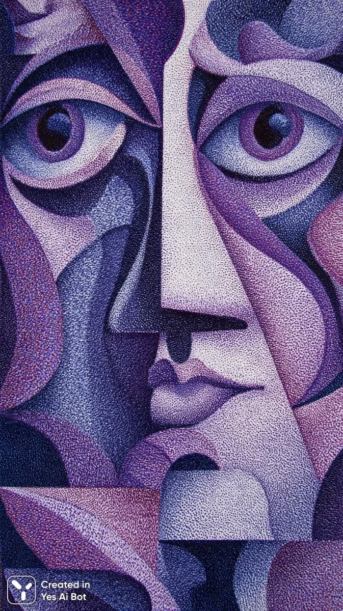 Завораживающий сюрреалистический рисунок чернилами представляет собой портрет лица с огромными круглыми глазами и выразительными чертами. Фон полностью поглощен глубоким фиолетовым цветом, переплетающимся со спиралевидными формами, создающими ощущение глубины и движения. Яркий контраст цветов достигается за счет использования геометрических узоров, которые добавляют динамичности и сложности композиции. Общий стиль изображения – абстрактный и современный, с акцентом на асимметрию и смелые линии, что придает работе неповторимый характер. Художественная интерпретация лица выходит далеко за рамки реализма, погружая зрителя в мир фантазий и подсознательных образов. Использование чернил позволяет добиться высокой детализации и тонких переходов цвета, подчеркивая выразительность каждой линии и формы. Рисунок излучает энергию и загадочность, приглашая к размышлениям о природе восприятия и связи между реальностью и воображением. Это произведение – не просто портрет, а скорее исследование человеческой личности через призму абстрактного искусства, где эмоции и чувства выражаются в ярких красках и неожиданных формах. Сложная игра света и тени создает объемный эффект, придавая изображению дополнительную глубину и реалистичность, несмотря на его сюрреалистическую природу. Каждая деталь тщательно продумана, чтобы вызвать у зрителя сильные эмоции и заставить задуматься о скрытых смыслах, лежащих в основе произведения