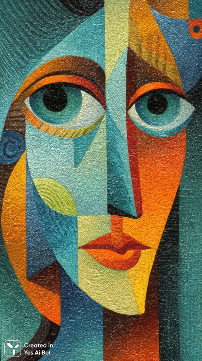 Лицо в геометрии: яркий портрет в стиле кубизма с игривым настроением - Пример генерации нейросети Миджорни