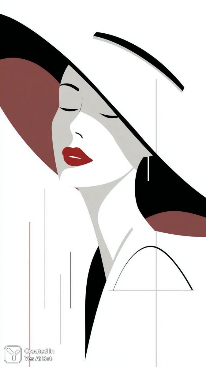 Изящный портрет женщины, погружённой в безмятежную дрему. Её лицо, обрамлённое широкополой шляпой в графичной черно-белой полоску, излучает спокойствие и утончённость. Яркий акцент алого цвета на губах добавляет образу нотку дерзости и загадочности, контрастируя с общей лаконичностью композиции. Стиль современной минималистической живописи выражается в простых формах и отсутствии лишних деталей, создавая ощущение чистоты и гармонии. Фон выполнен в виде белой поверхности, пересечённой вертикальными чёрными линиями – это графическое решение подчеркивает строгость линий и придает изображению современный вид. Вся композиция выдержана в духе минимализма, где каждая деталь имеет значение, а простота форм позволяет зрителю сосредоточиться на выражении лица и игре света и тени, создавая ощущение глубины и эмоциональной насыщенности. Акцент на красной полосе символизирует энергию и страсть, скрытые за внешней сдержанностью образа. Это не просто портрет, это исследование красоты в простоте, где каждый элемент тщательно продуман для достижения максимального визуального эффекта. Работа выполнена в технике флэт дизайн, что придает ей современный и стильный вид, делая её идеальным решением для различных графических проектов и иллюстраций