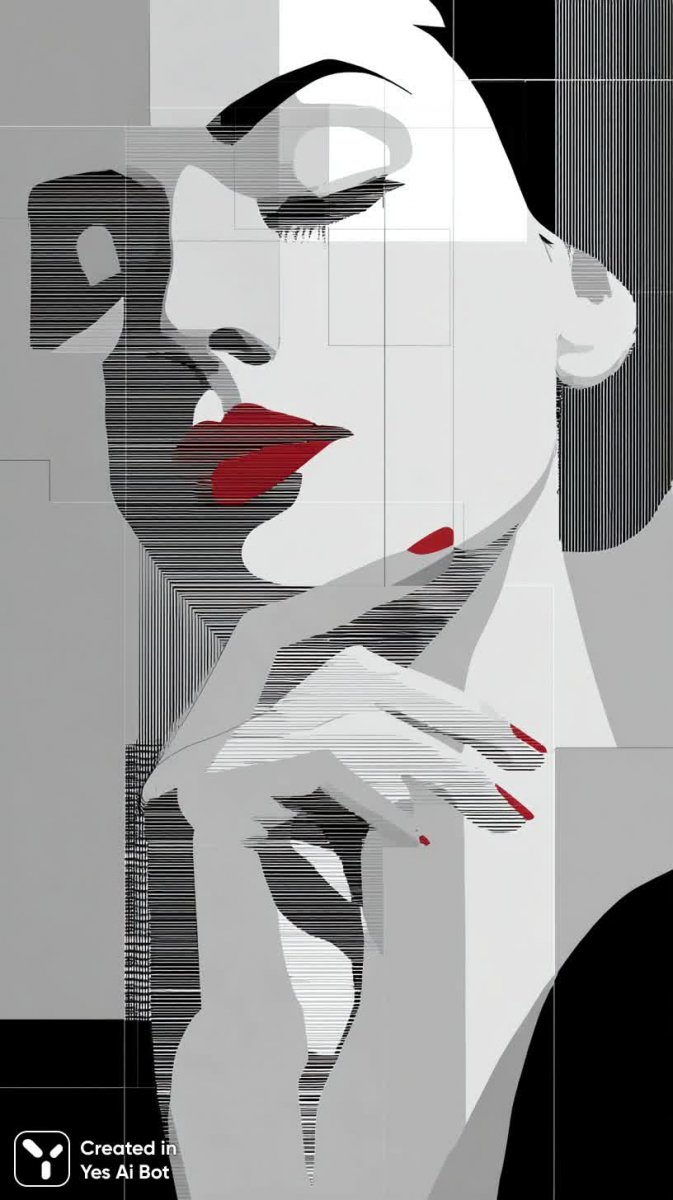 Элегантная черно-белая иллюстрация лица женщины, погруженной в размышления. Ее глаза закрыты, что придает образу загадочность и внутреннюю сосредоточенность. Яркий акцент – смело нанесенная красная помада, выделяющая чувственность и уверенность в себе. Одна рука задумчиво покоится на подбородке, подчеркивая момент глубокой мысли или легкой меланхолии. Фон выполнен в виде горизонтальных линий чередующихся черного и белого цветов, создавая графичный эффект и добавляя композиции современности. Стиль иллюстрации – плоский и минималистичный, характерный для современного дизайна. Работа выполнена с акцентом на четкость линий и контрастность, что усиливает визуальное воздействие и делает изображение запоминающимся. Эта картина идеально подойдет для оформления интерьера в стиле лофт или модерн, а также может стать отличным украшением для печатной продукции или цифровых платформ, где требуется лаконичный и стильный образ. Изображение передает атмосферу спокойствия и утонченности, сочетая в себе классическую красоту с современными тенденциями в искусстве и дизайне. Оно воплощает собой элегантность, загадочность и глубокие размышления, оставляя простор для интерпретации зрителя. Эта иллюстрация — это не только изображение лица, но и запечатленный момент внутренней гармонии и созерцания