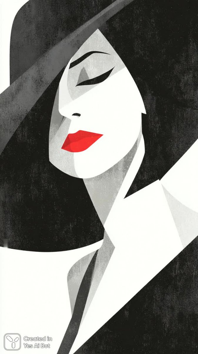 Изящный минималистичный портрет женщины, запечатленный в черно-белой гамме с ярким акцентом на губах. Лицо обрамлено стилизованными волосами, частично скрытыми под широкой черной шляпой, создающей эффект загадочности и утонченности. Глаза закрыты, что придает изображению атмосферу спокойствия и созерцательности. Простота форм и отсутствие излишних деталей подчеркивают элегантность образа, а четкие линии и геометрические фигуры придают композиции современный вид. Ключевым элементом является насыщенный красный оттенок губной помады, который выступает в роли яркого цветового акцента и привлекает внимание к выразительности лица. Фон, выполненный в виде простых вертикальных полос, создает контраст с деталями портрета, обеспечивая визуальную легкость и гармонию. Эта графическая иллюстрация сочетает в себе классическую красоту женского образа и современные тенденции минимализма, создавая запоминающееся произведение искусства, которое способно вызвать широкий спектр эмоций и ассоциаций у зрителя. Акцент на красной полосе подчеркивает современный подход к дизайну и визуальной коммуникации, делая изображение динамичным и привлекательным для широкой аудитории
