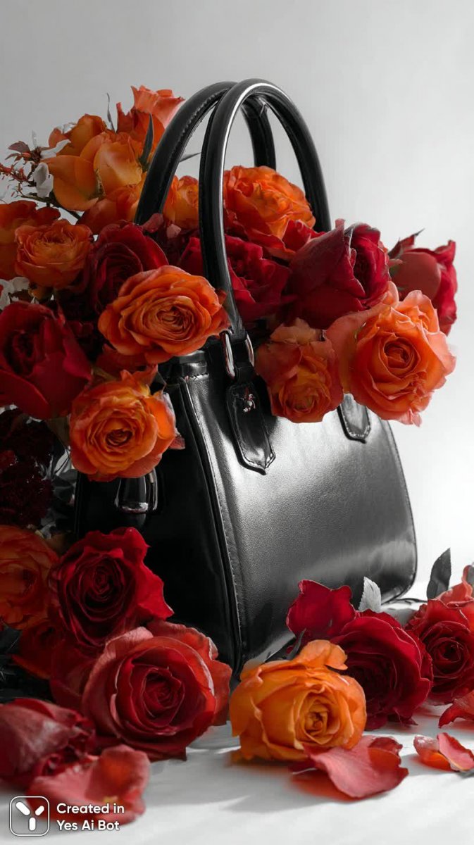 large still life featuring black leather handbag with red roses spilling out, BG is white, roses in full bloom with vibrant red petals, a touch of sophistication and charm.