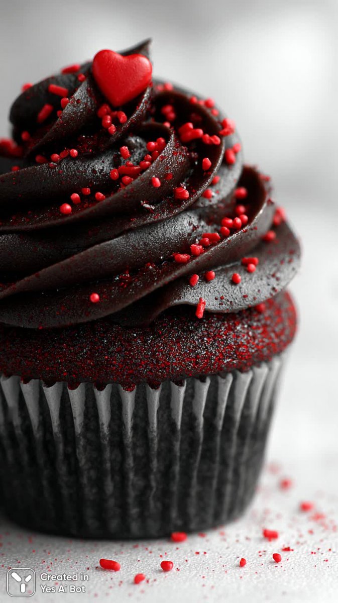 high-quality photograph of red velvet cupcake topped with rich dark chocolate frosting, decorative red sprinkles, BG is pristine white, capturing a sense of indulgence and sweetness.