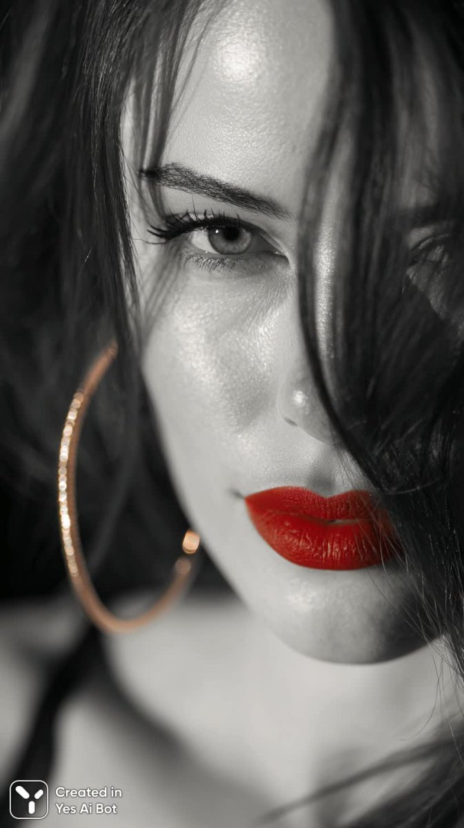 Загадочный портрет женщины, пленяющий своей элегантностью и уверенностью. Глубокий красный цвет помады эффектно контрастирует с длинными темными волосами, обрамляющими лицо, создавая образ роковой красавицы. Золотые серьги-кольца добавляют нотку роскоши и изысканности, подчеркивая безупречный вкус героини снимка. Мягко размытый фон акцентирует внимание на лице модели, усиливая ощущение интриги и притягательности. Взгляд женщины пронзителен и полон загадок, приглашая зрителя заглянуть в ее внутренний мир. Это не просто фотография – это история, рассказанная без слов, повествующая о силе, чувственности и неподдельной красоте. Портрет излучает ауру уверенности и соблазна, оставляя неизгладимое впечатление. Композиция продумана до мелочей: игра света и тени, акцент на деталях – все это создает гармоничный образ, вызывающий восхищение и желание разгадать тайну этой очаровательной женщины. В ней чувствуется глубина характера и внутренний стержень, что делает этот портрет поистине запоминающимся произведением искусства. Кажется, будто она знает секрет вечной красоты и уверенности в себе, который хочет постичь каждый зритель