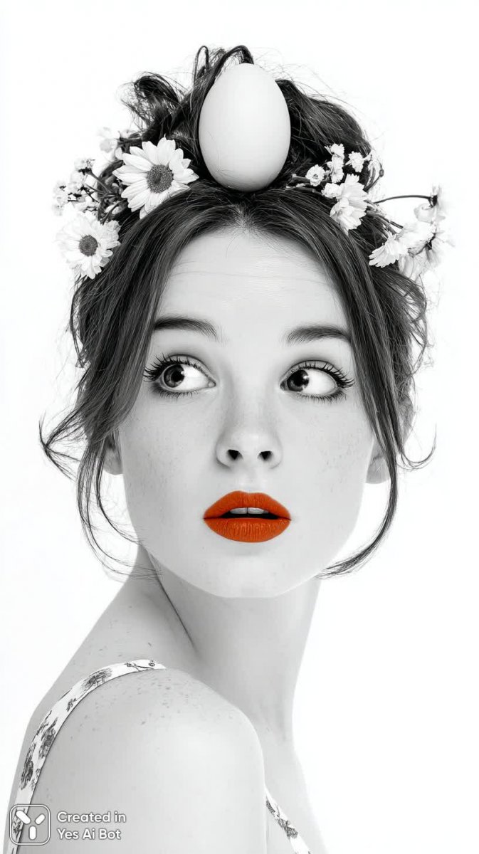 Невероятное сочетание абсурда и элегантности! Перед зрителем предстает монохромный портрет загадочной женщины, чья поразительная внешность не оставляет равнодушным. Ее лицо, выражающее искреннее удивление, обрамлено пышной прической, украшенной яркими цветами, создающими эффектный контраст с черно-белым фоном. Акцент на губах подчеркнут смелый макияж – насыщенная помада добавляет образу дерзости и уверенности. В центре внимания – неожиданный элемент: яйцо, покоящееся на лбу модели. Этот сюрреалистический акцент вносит нотку юмора и провокации, заставляя зрителя задуматься о смысле происходящего. Простота фона позволяет полностью сосредоточиться на деталях лица и выразительности эмоций. Портрет излучает атмосферу загадочности и интриги. Он словно приглашает зрителя разгадать тайну этой необычной женщины и интерпретировать смысл ее удивленного взгляда, а также понять символизм яйца – символа новой жизни, потенциала или просто причудливой случайности. Использование черно-белой гаммы подчеркивает классический стиль фотографии, одновременно придавая ей современный оттенок благодаря неожиданному сюрреалистическому элементу. Это произведение искусства способно вызывать широкий спектр эмоций и ассоциаций, оставаясь в памяти надолго