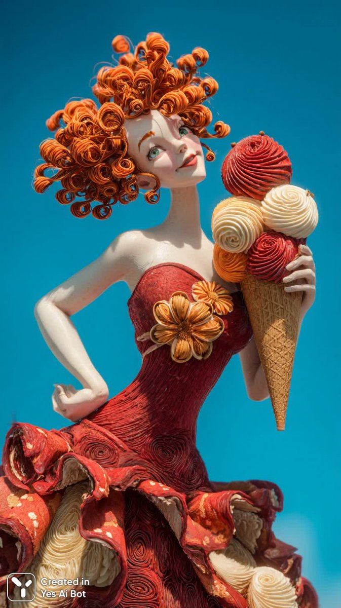 #1. sculpture of woman in a red dress, holding giant ice cream cone, colorful scoops of ice cream stacked high, hair styled in elegant curls, playful expression, bg is bright blue sky, whimsical and vibrant mood #role_stuff