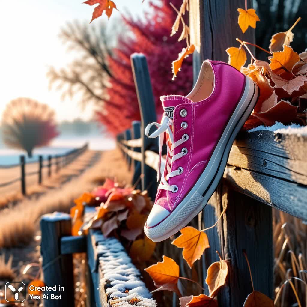 Осеннее настроение запечатлено в деталях: нежный розовый оттенок вечера окутывает старый деревянный забор, на котором висят яркие кеды Converse. Букет опавших листьев, словно драгоценность, украшает их шнурки, создавая неповторимый контраст с холодным зимним морозцем. Сухая трава и укрытые инеем листья дополняют картину увядающей природы, передавая атмосферу тихой сельской местности. Высокая детализация и глубокие насыщенные цвета позволяют ощутить текстуру каждого элемента – от шершавой поверхности забора до хрупкости опавших листьев. Эта фотография, выполненная в стиле гиперреализма, поражает своей красотой и художественностью, превращаясь в идеальный фон для вашего экрана. В ней гармонично сочетаются ностальгия по ушедшему лету и предвкушение зимней сказки, создавая ощущение тепла и уюта даже в самый холодный день. Это не просто изображение – это окно в мир осенних воспоминаний, наполненное ароматом опавшей листвы и тихим шепотом ветра. Каждый пиксель пропитан атмосферой застывшего времени, приглашая зрителя окунуться в эту завораживающую красоту