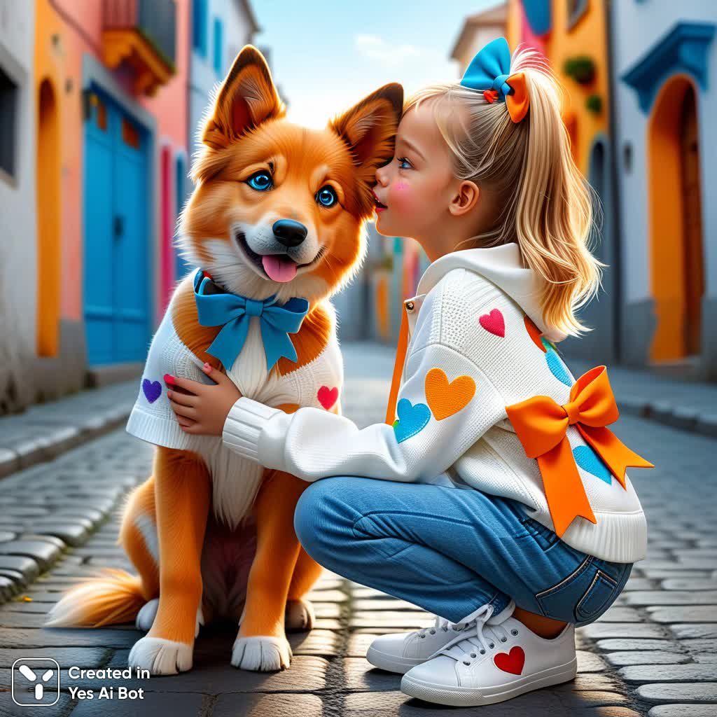 Нежная картина момента: юная проказница с золотистыми волосами и небесными глазами, украшенными милой бантиком, в белоснежном свитере, усыпанном яркими эмодзи, и джинсовом комбинезоне с забавными нашивками, дарит нежное поцелуй бездомному псу. Его шерсть взлохмачена ветром, а взгляд выражает легкое недовольство этой внезапной лаской, но в его глазах можно увидеть и благодарность. Яркий фон в оттенках серо-оранжевого усиливает контраст с чистым образом девочки и добавляет динамики сцене. Картина выполнена в реалистичной манере с использованием передовых 3D компьютерных технологий, что придает ей невероятную глубину и детализацию. Чувствуется теплота момента, искренность детской любви и неподдельный интерес к окружающему миру. Эта фотография – воплощение беззаботности, доброты и очарования детства, запечатленное в цифровом формате с потрясающей точностью. Она способна вызвать улыбку и напомнить о простых радостях жизни, о важности сострадания и умении видеть красоту даже в самых обыденных вещах. Взгляд девочки полон нежности, а поза передает безграничную любовь к этому четвероногому другу. Эта сцена – настоящий гимн дружбе между человеком и животным, наполненный светом и позитивом