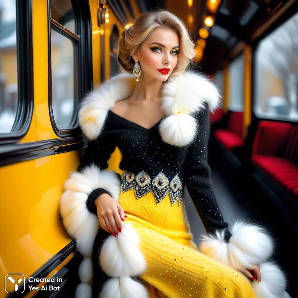 красивая женщина, милая, утончённая, кокетливая пушистая, мягкая, вязаная, теплая, уютная, ангора пушистая, расшитая бисером, черный, серебристый, жёлтый шлейф в стиле художников Вибке Рауэрс, Константин Разумов v.2.5 pro