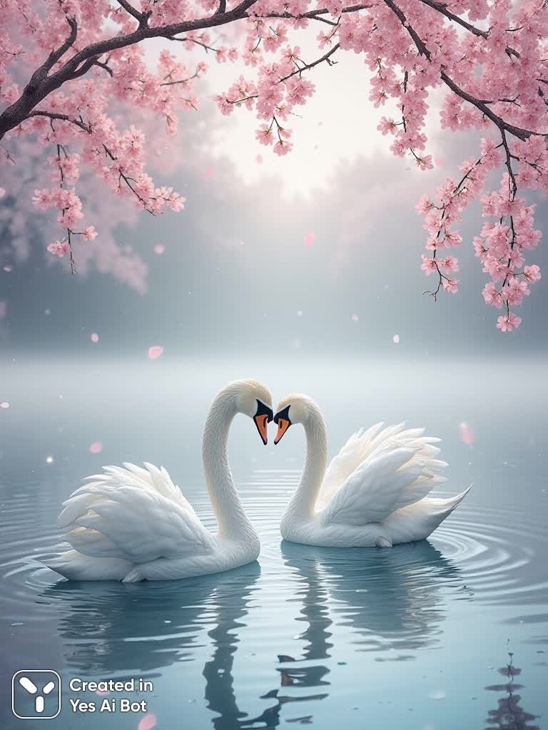 Two swans gliding across a crystal-clear pond, raindrops creating rippling circles, blooming cherry blossom trees arching overhead, subtle pink petals drifting down, soft pastel color palette, hyperrealistic style reminiscent of Thomas Kinkade, reflective water surface, gentle fog in the background, intricate feather textures, sense of tranquility and intimacy, early spring morning, cgi, 1024K