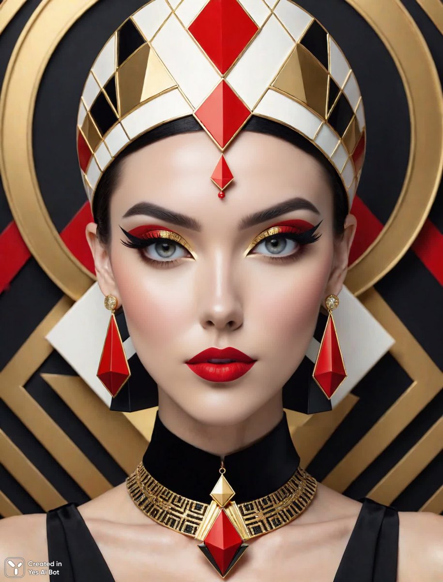 Stylized portrait of a woman (facing the viewer: 1.2), in the center of the frame (white skin: 1.2), (age: 25: 1,1), (detailed facial features: 1,3), full red lips, (smoky eye makeup: 1,2), wearing a black and gold geometric Art Deco headdress, gold drop earrings and black collar, geometric shapes in red and black, abstract background, modern art, cubism style, clean lines, minimalist design, (gold accents: 1,3), high contrast, (digital painting: 1,2), artstation, 8k resolution, (bright color palette: 1,1), clear details, (elegant atmosphere: 1,2).