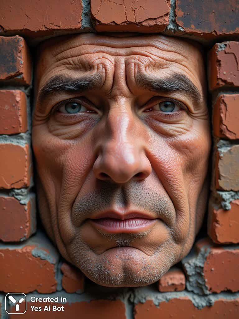 Завораживающий портрет человека, сотканный из красного кирпича, словно ожившая стена. Лицо зрелого мужчины в возрасте от пятидесяти до шестидесяти лет, с выраженной текстурой и следами времени, мастерски воссоздано из грубого строительного материала. Кирпичная структура передает морщины и контуры лица, создавая удивительно реалистичный эффект. Возраст и этническая принадлежность мужчины трудно определить однозначно, но черты лица намекают на европейские или средиземноморские корни. Взгляд пронзительных голубых глаз задерживает внимание, а детально проработанные ресницы и видимые вены на белке глаза добавляют реалистичности изображению. Выражение лица сдержанное, почти задумчивое, с легкой грустью, отраженной в уголках губ. Оттенки красно-коричневого кирпича плавно переходят друг в друга, создавая ощущение глубины и объема. Игра света и тени подчеркивает текстуру кирпичной поверхности и трехмерность формы. Размытый фон из кирпичной стены акцентирует внимание на лице, а симметричная композиция с центральным расположением лица направляет взгляд зрителя прямо на его пристальный взгляд. Картина пропитана атмосферой торжественности и легкой меланхолии, сочетая в себе элементы современного скульптурного искусства и сюрреализма, напоминая архитектурную фантазию, воплощенную в необычном материале. Это поистине впечатляющая работа, демонстрирующая виртуозное владение техникой гиперреализма и способность видеть красоту в неожиданных сочетаниях
