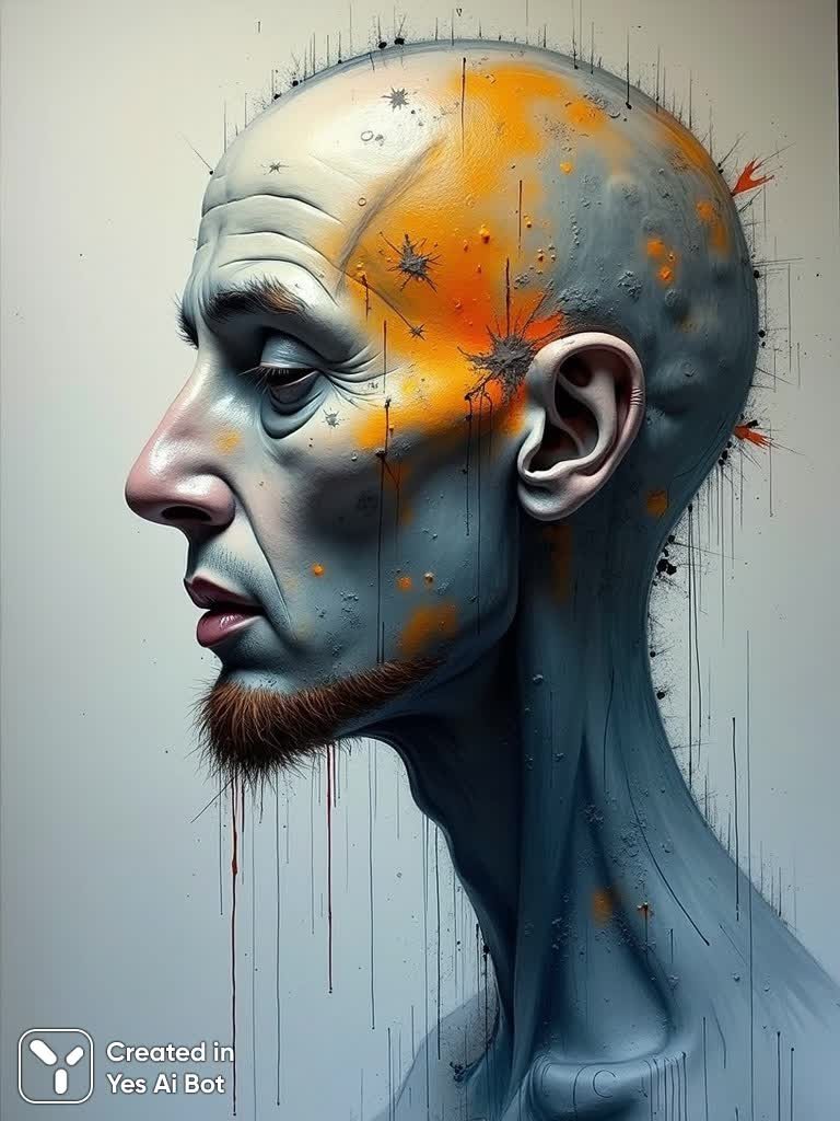Загадочный портрет, словно запечатлённый отголосок времени, представляет собой визуальную поэму о бренности бытия и неумолимом течении лет. Изображение, выполненное в технике абстрактного экспрессионизма с ярко выраженными мазками и эффектной работой фактуры, демонстрирует лицо в профиль, будто выцветшее под палящим солнцем прожитых жизней. Палитра картины – это буйство контрастов: холодные оттенки серого и глубокого синего переплетаются с огненными всплесками оранжевого и тёплыми лучами жёлтого, создавая драматическую игру света и тени. Лишь намеками проступают черты лица: угадывается контур носа, бездонные глазницы, выступающие щёки и лёгкий намёк на бороду или подбородок – всё это словно ускользает от пристального взгляда, оставляя пространство для воображения. Густая пастозная живопись придает изображению объем и глубину, а плавные переходы между цветами создают ощущение движения и энергии. Мягкое рассеянное освещение подчеркивает текстуру краски, акцентируя внимание на мельчайших деталях. Композиция смещена от центральной оси, направляя взгляд зрителя к эмоциональному ядру образа, пронизанного атмосферой созерцания и лёгкой грусти. Фоном служит однотонный бледный серый цвет, который не перетягивает на себя внимание, а лишь усиливает выразительность центральной фигуры. Вся работа дышит свободой и импульсивностью, характерными для стиля абстрактной живописи, отражая внутренний мир человека, его переживания и размышления о жизни. Это не просто портрет – это состояние души, запечатлённое на холсте в вихре красок и эмоций