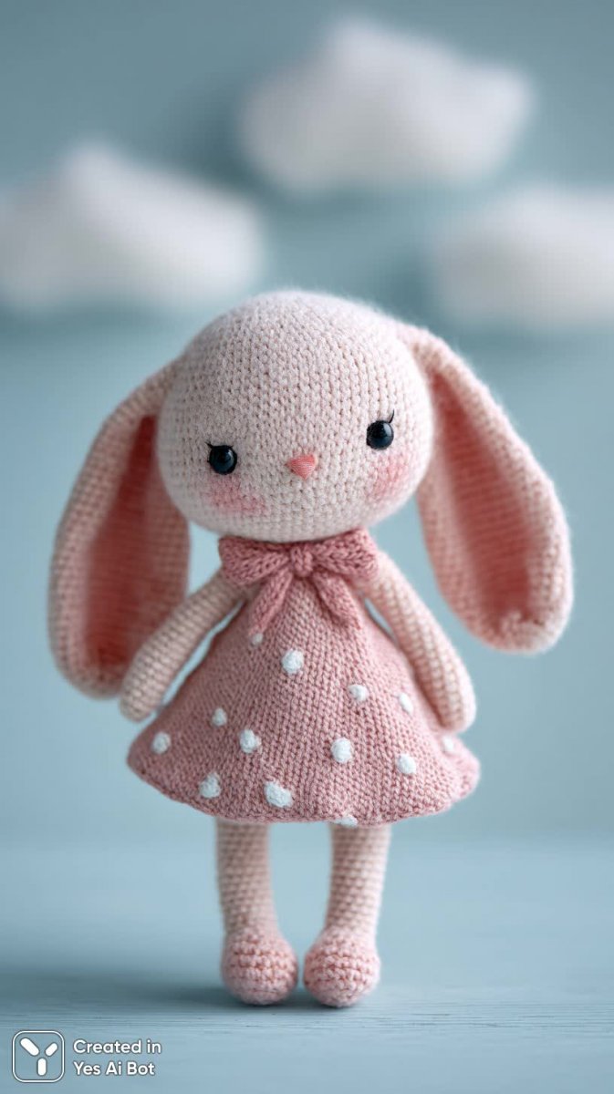 crocheted bunny with large ears, made of soft pink yarn, round body with small black eyes, wearing a tiny blue dress with white polka dots and a matching bow, sitting on a light blue BG filled with fluffy clouds.