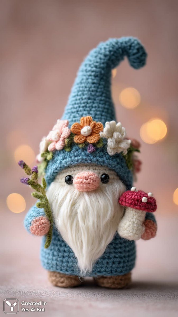 crocheted gnome with blue hat and white beard, holding tiny mushroom in left hand, standing on soft pink BG, hat adorned with colorful flowers, whimsical and playful demeanor, small round face with bright eyes.