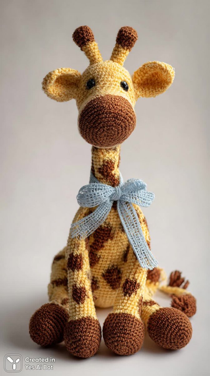 midjourney Милый вязаный жирафчик: очаровательная игрушка ручной работы с бантиком. Нейросеть Midjourney