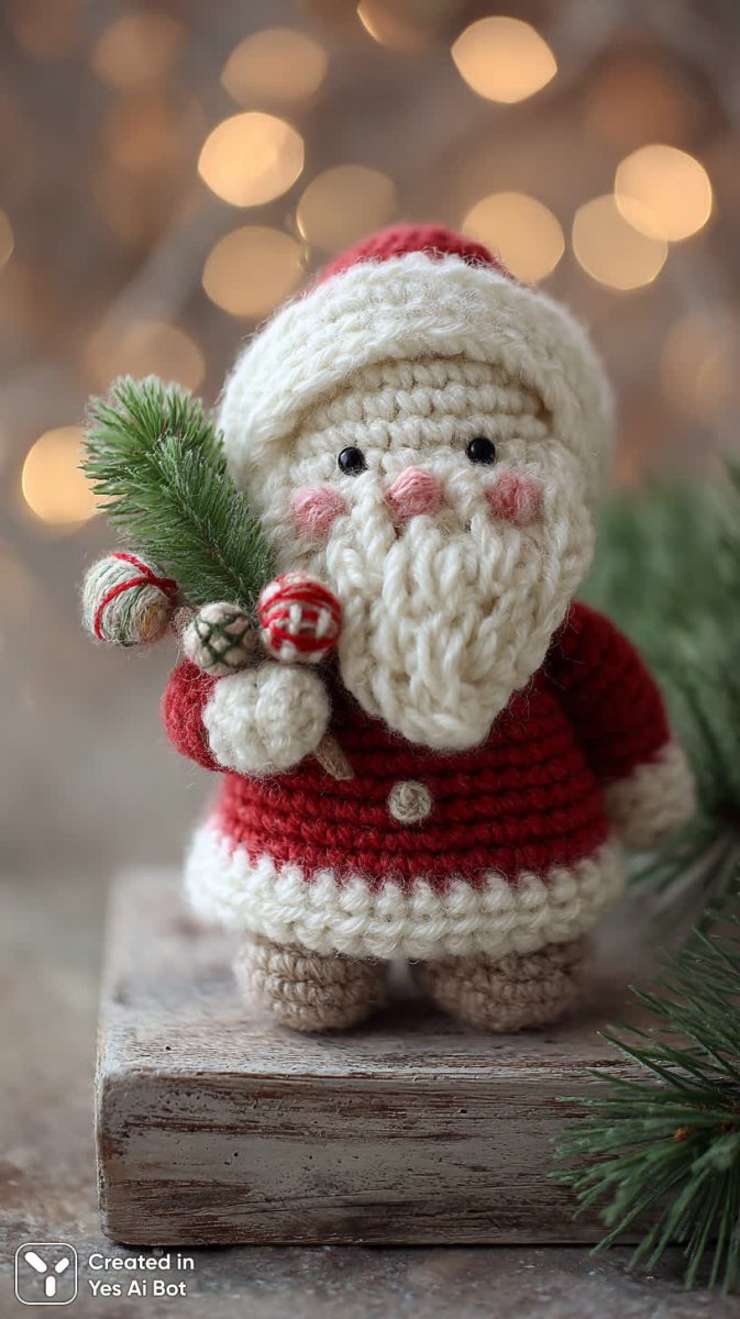 Милый вязаный Санта-Клаус уютно расположился на полке, излучая праздничное настроение и даря тепло своим присутствием. В его руках – миниатюрная разноцветная ёлочка, символ новогодних чудес и радости. Лицо Санты светится искренней улыбкой, а румяные щеки добавляют ему очарования и беззаботности. Он одет в яркий красный костюм, который словно переливается праздничными огоньками, создавая атмосферу волшебства и предвкушения чуда. Светлый и жизнерадостный фон усиливает общее ощущение радости и создает идеальную картину для рождественского декора или уютного домашнего уюта. Этот маленький вязаный персонаж станет прекрасным украшением интерьера, напоминая о самом духе праздника – доброте, щедрости и вере в сказку. Он подарит теплоту и позитив всем, кто увидит его, наполняя дом атмосферой волшебства и рождественского настроения на долгие дни. Этот очаровательный Санта – идеальный подарок для близких или просто приятный способ порадовать себя и создать праздничное настроение в своем доме