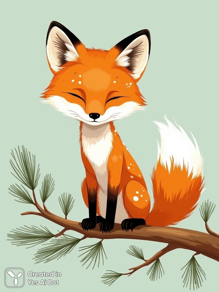 A digital illustration of a red fox sitting on a pine branch. The fox looks at the camera, raising its ears and looking directly at the viewer. Its fur is reddish-brown with white spots on its muzzle and chest. Its tail is curled around its body and its paws rest on the branch. The background is light blue-green, with several pine needles scattered around the fox. The overall mood of the image is peaceful and serene.