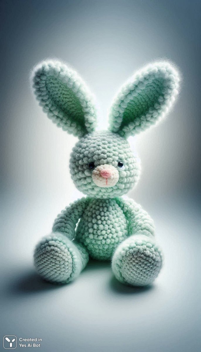 dalle Милый вязаный зайчик из пушистой мятной пряжи с большими ушами и круглой тушкой. Генерация из нейронной сети Далли 3