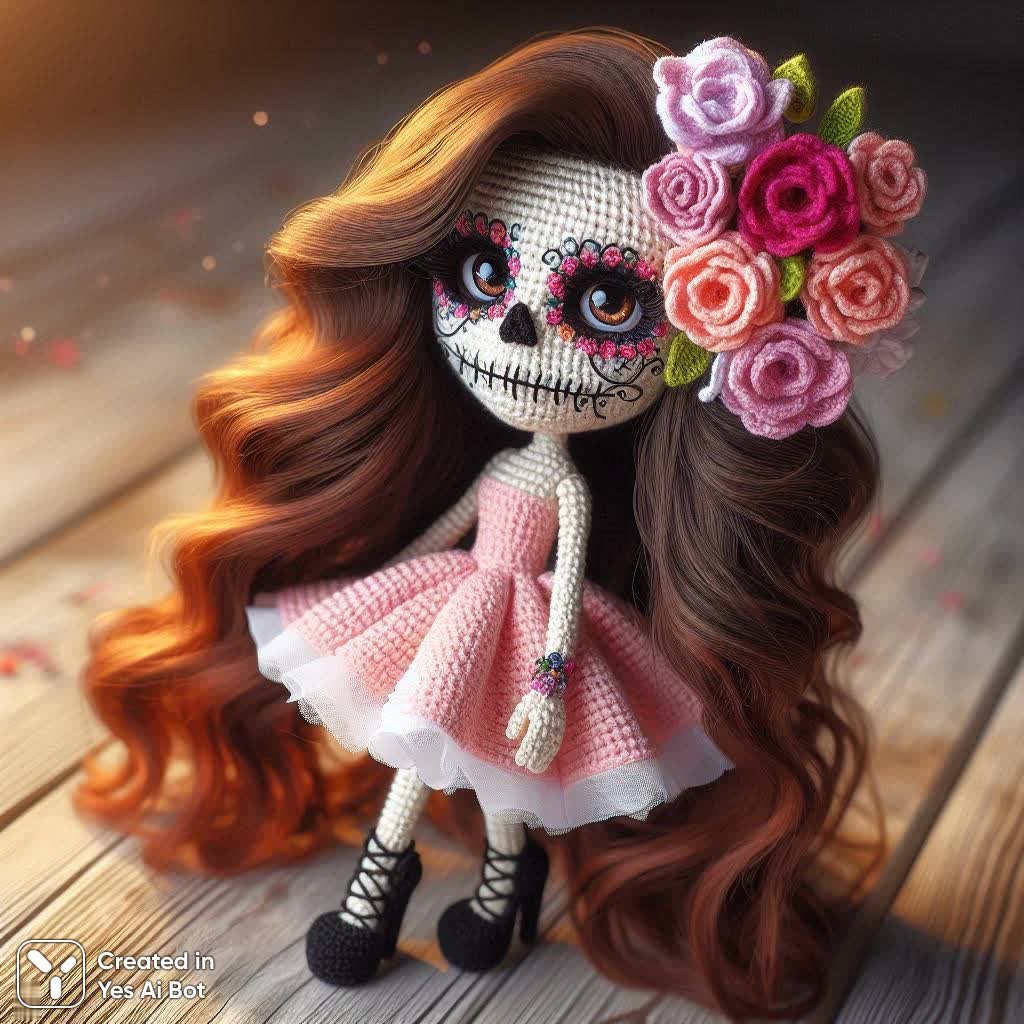 Загадочная кукла ручной работы, созданная с использованием техники вязания крючком, воплощает в себе уникальное сочетание нежности и таинственности. Её длинные волнистые каштановые волосы, ниспадающие мягкими локонами, придают образу утонченность и романтичность. Куклу облачает очаровательное платье, связанное из розовой и белой пряжи – нежная палитра подчеркивает её хрупкость и деликатность. Однако внимание привлекает необычное лицо куклы, напоминающее череп, но смягченное ярким цветочным декором. Разноцветные цветы, украшающие лицо, создают контраст между мрачностью и жизнерадостностью, добавляя образу загадочности и символизма. Завершают образ элегантные черные высокие каблуки, придающие кукле нотку дерзости и уверенности. Фоном для этой причудливой композиции служит размытая деревянная поверхность, которая создает ощущение глубины и подчеркивает акцент на самой кукле. Это не просто игрушка – это произведение искусства, сочетающее в себе мастерство ручной работы, оригинальный дизайн и глубокий символизм, способное вызвать самые разные эмоции и ассоциации у зрителя. Кукла словно оживает на фоне размытого деревянного полотна, приглашая нас заглянуть в мир фантазий и воображения, где встречаются красота и тайна, нежность и загадка. Она является воплощением уникальности и неповторимости, демонстрируя безграничные возможности творчества и мастерства рукоделия