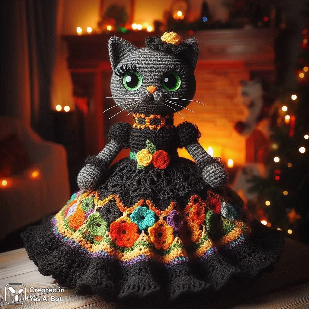 crocheted toy in shape of cat wearing black dress with ruffled skirt, different colors and patterns including orange, yellow, green, purple, black, two green eyes, body covered in black stitches, bg is cozy and festive.