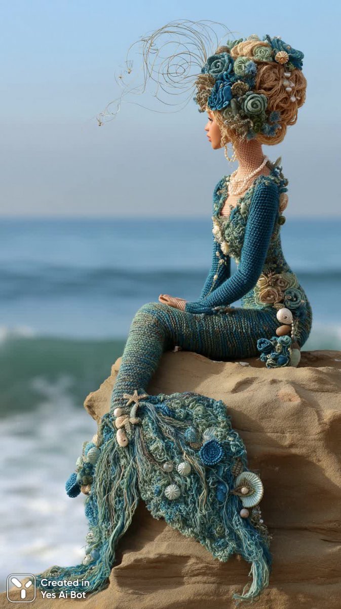 charming crocheted mermaid doll, long flowing blue and green tail, decorated with shells and pearls, wearing a matching top, intricate detail in hair made of yarn, sitting on a rock near a tranquil sea with soft waves in the background.