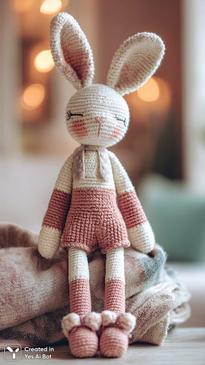 crocheted bunny toy in pink and white, wearing stylish outfit with high-heeled shoes, playful expression, large floppy ears, sitting on soft pastel blanket, bg is cozy living room.