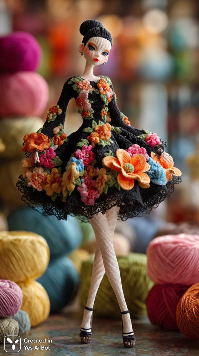 crocheted figure with intricate designs, wearing fashionable black ensemble with high heels, surrounded by yarn balls in various colors, bg is bright studio filled with crafting supplies.