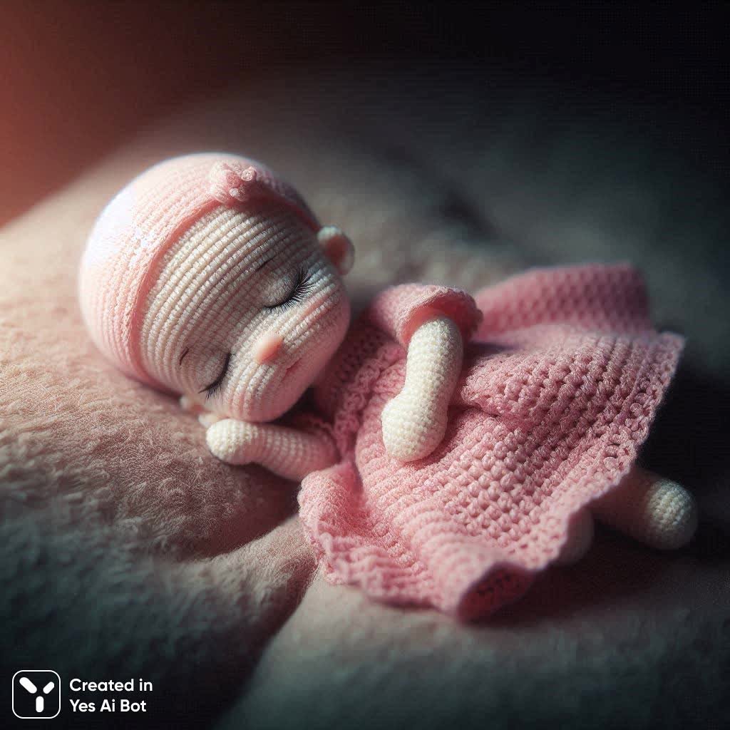 a simple yet adorable amigurumi baby girl doll in a pink dress, lying on a soft textured surface, highlighted by gentle ambient lighting, taken with a 24mm lens for an intimate feel.