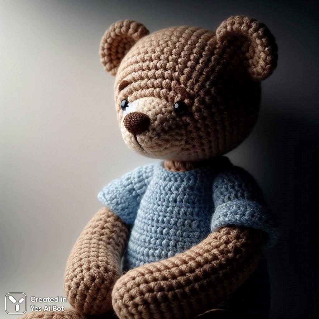 Милый вязаный медвежонок ручной работы, созданный из нежного светло-коричневого пряжи, излучает тепло и уют. Его очаровательный внешний вид дополнен голубой рубашкой в белую полоску, добавляющей игривости образу. Круглое личико украшают большие черные глаза, выражающие безмятежность и доброту, а маленькие ушки придают ему трогательную невинность. Медвежонок удобно сидит, сложив руки на груди, демонстрируя расслабленность и уверенность в себе. Простое белое фоновое изображение позволяет полностью сосредоточиться на деталях этого очаровательного мягкого друга, подчеркивая его мастерство исполнения и привлекательность. Этот вязаный медведь станет прекрасным подарком для детей или любителей ручной работы, принося радость и комфорт каждому, кто им владеет, напоминая о тепле домашнего очага и безграничной любви. Он идеально подойдет для украшения детской комнаты, создания уютной атмосферы в гостиной или просто как милый сувенир, который согреет душу в холодные дни. Его мягкость и приятный внешний вид делают его идеальным спутником для игр и обниманий