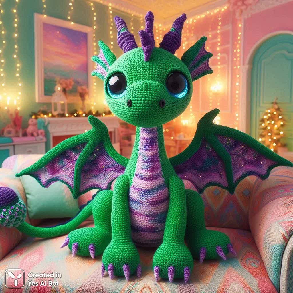 crocheted dragon toy, vibrant green and purple yarn, large wings spread wide, big round eyes with glittering pupils, sitting proudly on colorful bedspread, whimsical and magical vibe, bg is pastel-colored room with fairy lights.